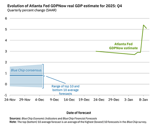 The Atlanta Fed currently expects 5.1% annual GDP growth in the fourth quarter, as estimates nearly doubled recently. Based on January 5 estimates, the Atlanta Fed expected the fourth-quarter 2025 GDP growth of only 2.7%. But the January 9 estimate showed the expectation for 5.1%.