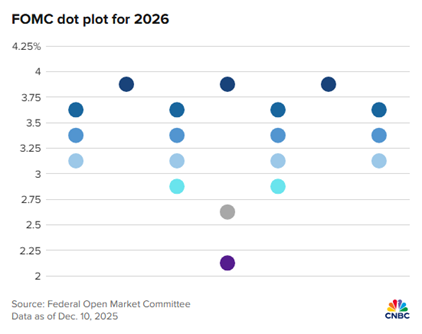 Interestingly, the latest “dot plot” showed very differing opinions on the central bank’s way forward. Four members expect one 0.25% rate cut, four anticipate two 0.25% cuts, and four think that rates should remain between 3.5% and 3.75% in 2026.