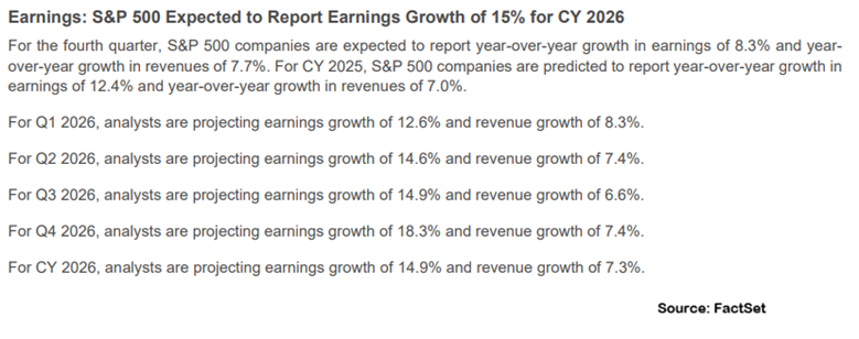 According to FactSet, the S&P 500 is projected to achieve 14.6%, 14.9% and 18.3% average annual earnings growth in the second, third and fourth quarters, respectively. For calendar year 2026, analysts anticipate 14.9% average annual earnings growth.